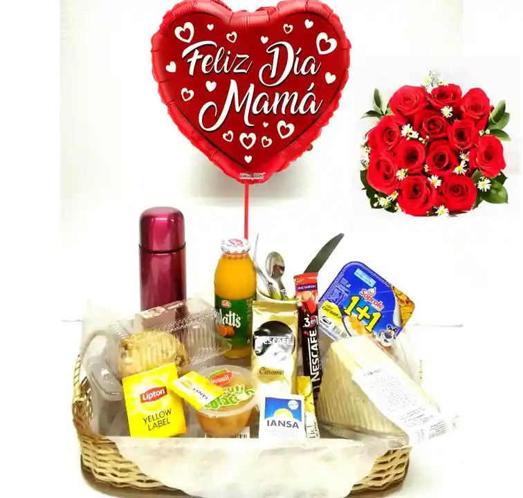 Este Clásico Desayuno, seguro una excelente alternativa para cualquier ocasión. La Bandeja incluye: Una Taza y un Termo Un Jugo de Naranja Un Muffin y un Sandwich pan miga Un Yogurt con cereal y una Porción de Frutas Sachet Café, Capuchino, Té varios sabores, azúcar y sacarina Servicio acero inoxidable, servilleta, Tarjeta con saludo. Globito de saludo (según motivo del mensaje) Todo envuelto en papel celofán y gran moño de cinta. Foto Referencial Más Hermoso Ramo con 12 Rosas Importadas. Seleccione el color de las Rosas.