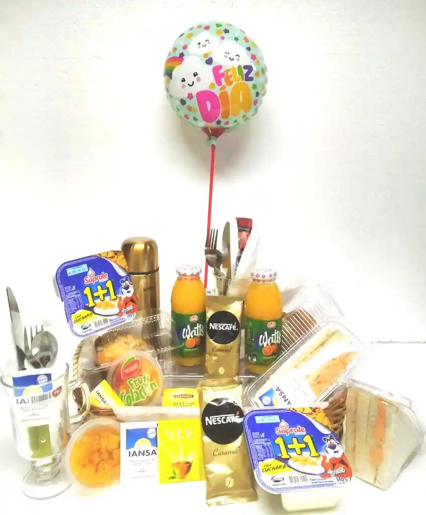 Este Clásico Desayuno para 3 personas, seguro una excelente alternativa para cualquier ocasión. La Bandeja incluye: 3 Tazas y un Termo 3 Jugos de Naranja 3 Muffins y 3 Sandwichs pan miga 3 Yogurts con cereal y 2 Porciónes de Frutas Sachets de Café, Capuchino, Té varios sabores, azúcar y sacarina 3 Servicios de acero inoxidable, servilleta, Tarjeta con saludo. Globito de saludo (según motivo del mensaje) Todo envuelto en papel celofán y gran moño de cinta. Foto Referencial