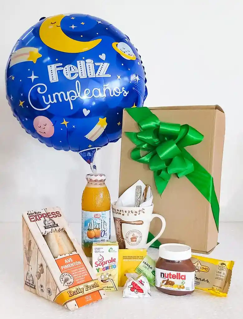 - Taza - Te - Sacarina - Jugo en caja - Jugo botella - Sándwich pan miga - Tostaditas - Nutella individual - Quesillo individual untable - Cubiertos - Tarjeta de saludo - 1 globo (motivo de acuerdo al saludo) - En presentación Caja Kraft