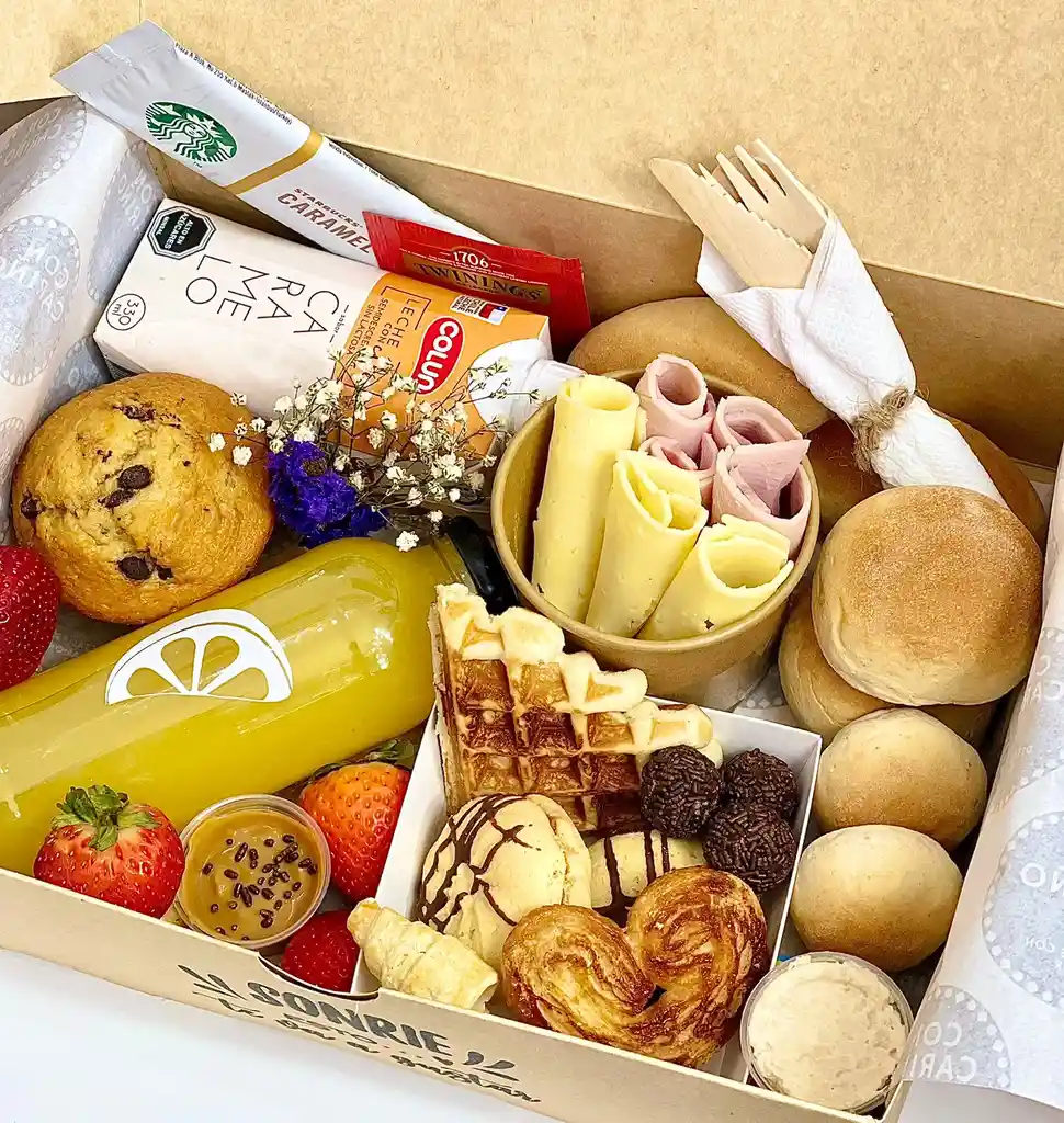Contenido: Caja Kraft Jugo natural 300cc Leche cappuccino 300cc Café sobre Starbucks te twings Pote jamón/queso Pon variedad Muffins Frutillas Salsa de manjar Cubiertos Mantequilla mini Pasta Ave mayo Waffle Trufas mini Mini cachito Galletas mantequillas rellenas Palmerita mini Mini ramo Tarjeta de envió