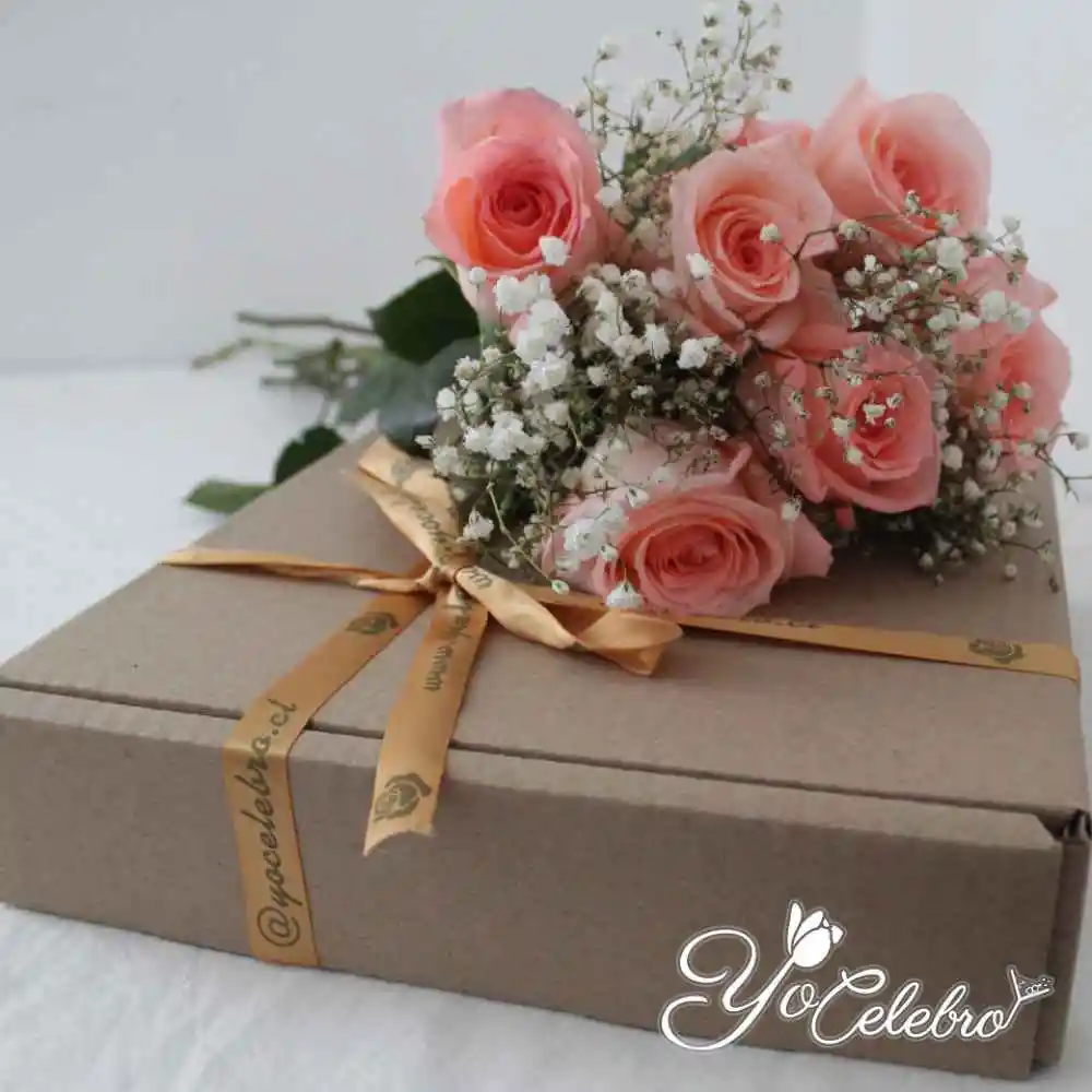Ramo de Flores 6 Rosas y Desayuno Josefa. Desayuno Josefa incluye: Un Jugo Afe o Amma Un té Twinings Un stick individual de Café Starbucks Croissant jamón queso Un Yogurt endulzado con avena y decorado con berries Una porción de masitas dulces Dos unidades de Bombones Ferrero Rocher Todo presentado en Caja con cinta de tela Opcional. Tarjeta con mensaje, indique mensaje en el carro de compra (gratis)
