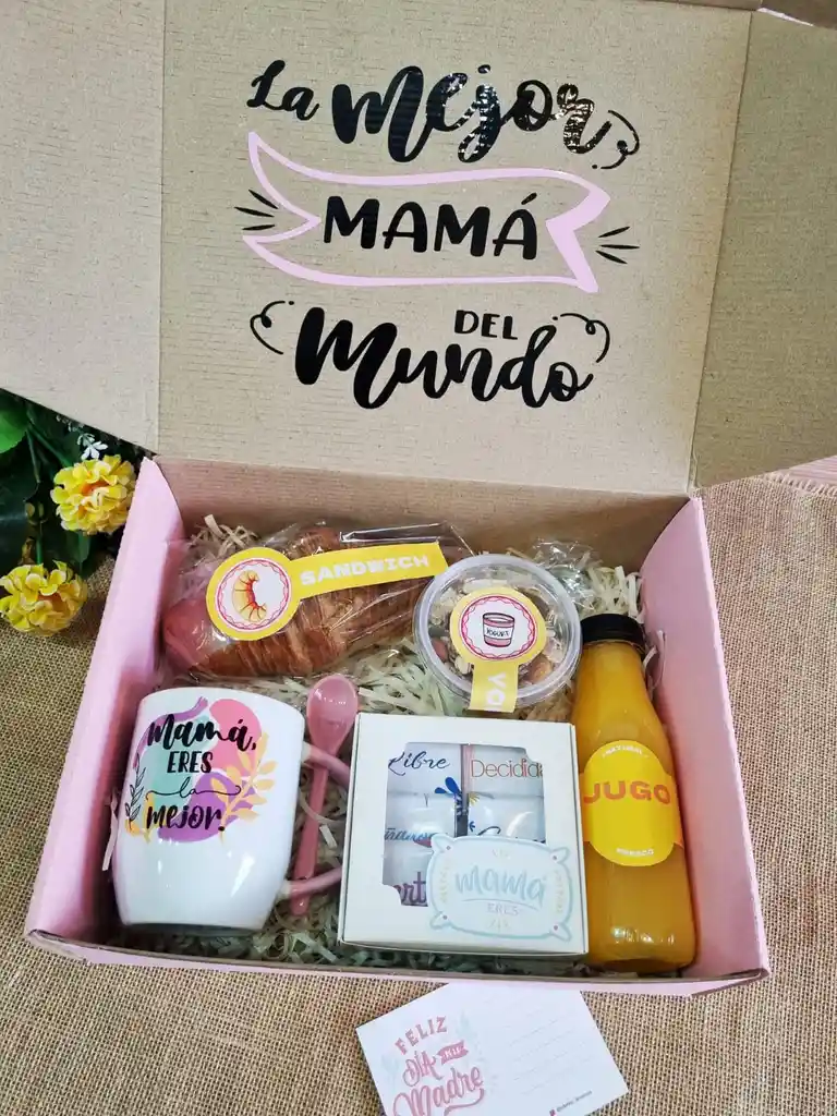 Caja sorpresa de desayuno. Incluye una botella de jugo, un croissant jamón queso, vaso con yoghurt con granola, taza con cuchara y caja de 6 chocolates artesanales. Además, va una tarjeta para que puedas dedicar tu regalo con algunas palabras. La caja va con frase especial de Feliz día.