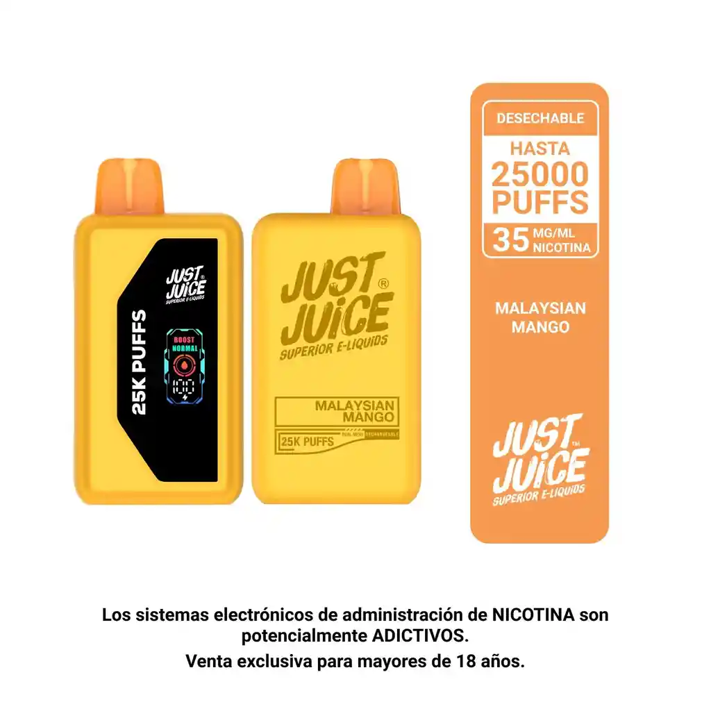 Disfruta la dulzura intensa y el aroma exótico del mango tropical en cada calada. Hasta 25.000 puffs en modo normal o 15.000 en boost, con flujo de aire regulable, batería recargable por USB-C y 35mg de nicotina.