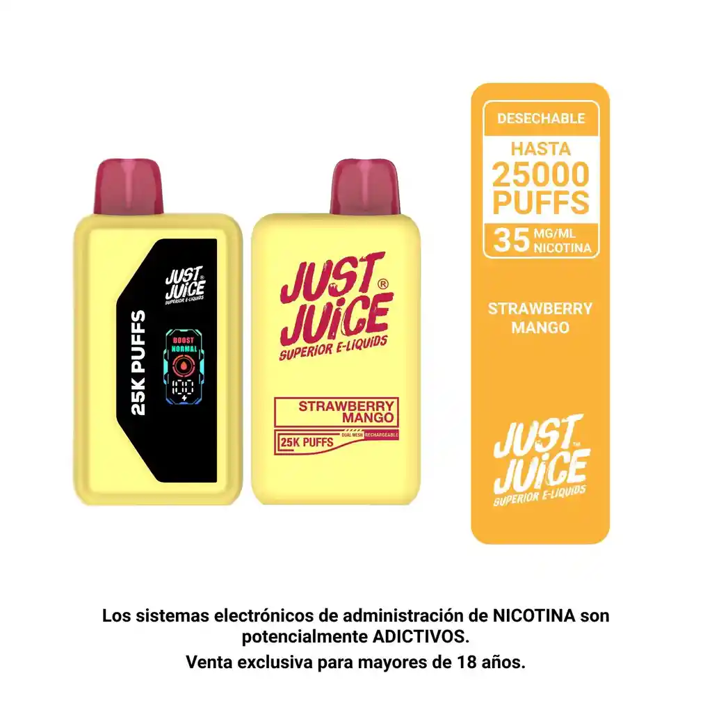 Una mezcla irresistible de frutilla dulce y mango tropical, frutal y equilibrada en cada calada. Hasta 25.000 puffs en modo normal o 15.000 en boost, con flujo de aire regulable, batería recargable por USB-C y 35mg de nicotina.
