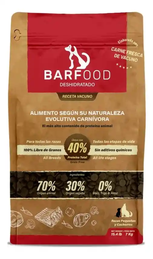 Alimento Deshidratado para Perros Razas Pequeñas Cachorros y Adultos y Razas Grandes Cachorros. Contiene 40% de Proteína Apto para combinar con Dieta Barf Chile Barfood Ingredientes: Carne fresca de vacuno, carne deshidratada de vacuno, hígado de vacuno, aceite de ave, hueso de vacuno finamente molido, mandioca, extracto de yuca, zanahoria, brócoli, espinaca, zapallo, cúrcuma, manzana, Omega 3 y 6, Vitaminas y Minerales.