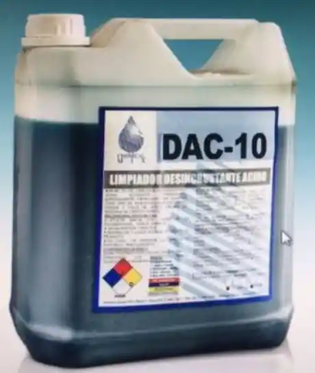 Dac-10 es un limpiador desincrustante ácido altamente concentrado, especialmente formulado para remover todo tipo de incrustaciones calcareas, óxidos y sales de ácidos grasos en sistemas de limpieza manual.\nEs un producto indicado para todo tipo de superficies, artefactos sanitarios, urinarios, duchas, bidet, etc.\nAlta dilucion.