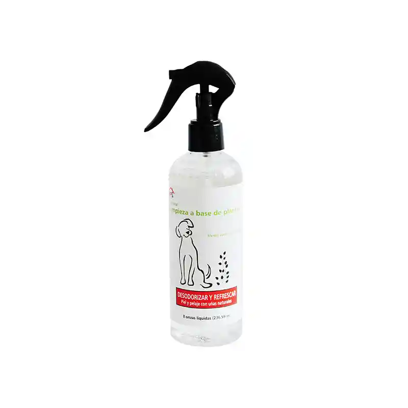 Eliminador de olores Listo Para Usar es un poderoso desodorizante desarrollado para remover olores molestos y desagradables en forma rápida y eficaz. Su formulación de triple acción con moléculas orgánicas suspendidas en el aire, limpia y deja un aroma fresco. Es altamente efectivo en lugares con constante exposición a desechos, materia orgánica, cigarro, humedad, comida, entre otros. Gracias a su formulación lista para usar, se evitan errores de dilución y se optimizan los tiempos. Es el producto perfecto para mantener a tu perro siempre fresco y con un aroma agradable. Su fórmula desodorante elimina los olores indeseables, dejando un aroma suave y duradero en el pelaje de tu mascota. Con un volumen de 8 onzas liquidas (236,59 mL), este spray es ideal para llevarlo contigo a donde quiera que vayas, asegurando que tu perro siempre esté presentable. Además, su condición de nuevo garantiza que recibirás un producto de calidad. No te preocupes por la inflamabilidad, ya que este producto es seguro de usar. Aprovecha esta oportunidad y dale a tu perro el cuidado que se merece con la limpieza a base de plantas menta verde de eucalipto. Modo de uso: Eliminar toda la suciedad causante del olor no deseado. Rellenar un Pulverizador con el producto Listo para Usar. Ajustar la boquilla para tener un pulverizado fino y aplicar en el centro del área a intervenir. No es corrosivo. En todos los caso esperar de 10 min. antes de enjuagar con agua o paño húmedo. Eliminador y Destructor de Olores Recomendado para perro. Con efecto desodorante.
