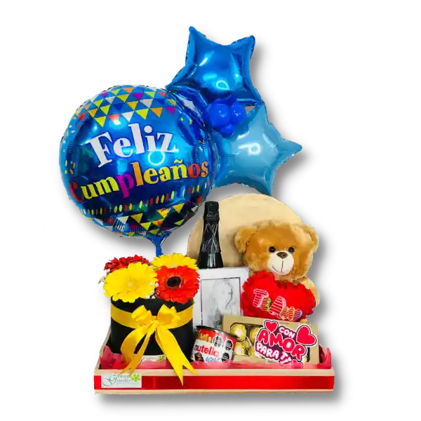 Hermosa bandeja con globos de cumpleaños, arreglo floral de gerberas, vino espumante, peluche de felpa, caja de bombones ferrero rocher, nutella de snack y un portaretratos. (Para agregar una imagen, enviarla al Whatsapp +56 9 4161 5695)