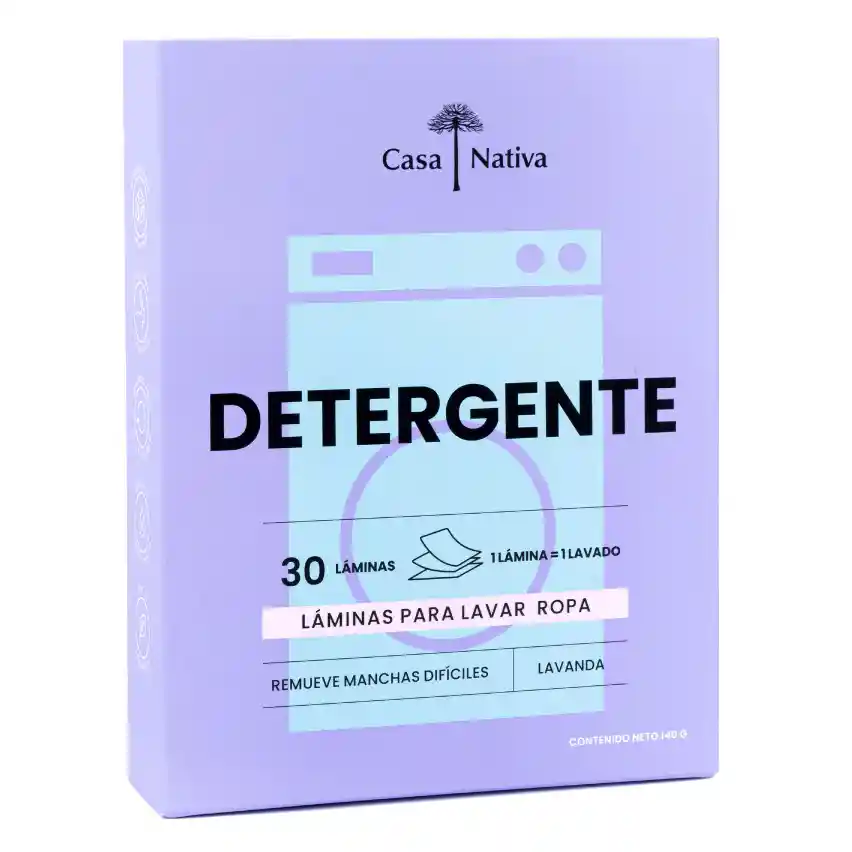 Detergente en Láminas Lavanda. ULTRACONCENTRADAS · SIN COMPONENTES TÓXICOS · BAJA HUELLA DE CARBONO · LIBRE DE BOTELLAS PLÁSTICAS. Perfectas para eliminar manchas difíciles como vino, sangre y café. Protegen tu ropa y el medio ambiente sin desperdicios de agua en el proceso productivo.