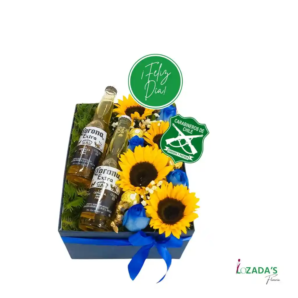 Arreglo Especial de 2 Cerveza Corona, Girasoles, 3 bombones Ferrero y Rosas con el logo de Carabineros y la imagen Feliz Día, para regalonear a tu Carabiner@ Favorit@.