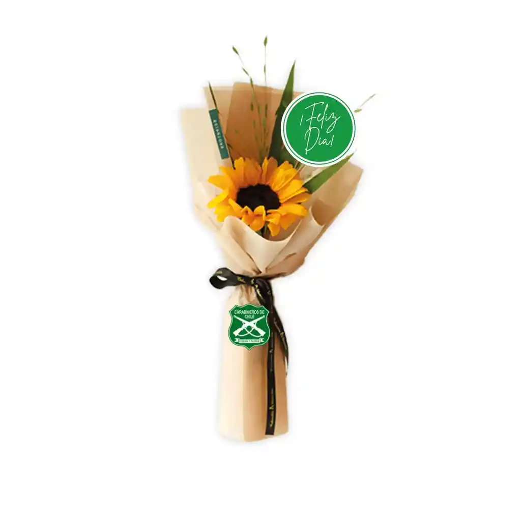 Arreglo Especial de un girasol con el logo de Carabineros y la imagen Feliz Día, para regalonear a tu Carabiner@ Favorit@.