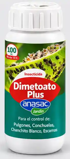 El **Dimetoato Plus 100 Cc Anasac** es un insecticida para jardín que sirve para controlar plagas en plantas ornamentales, hortalizas y frutales. Su acción combina efecto sistémico con acción de contacto, por lo que ayuda a controlar insectos como pulgones, conchuelas, escamas y chanchito blanco. Se utiliza diluido en agua y aplicado sobre la planta según indicaciones del fabricante, siendo una alternativa frecuente para manejo de plagas en jardines domésticos.