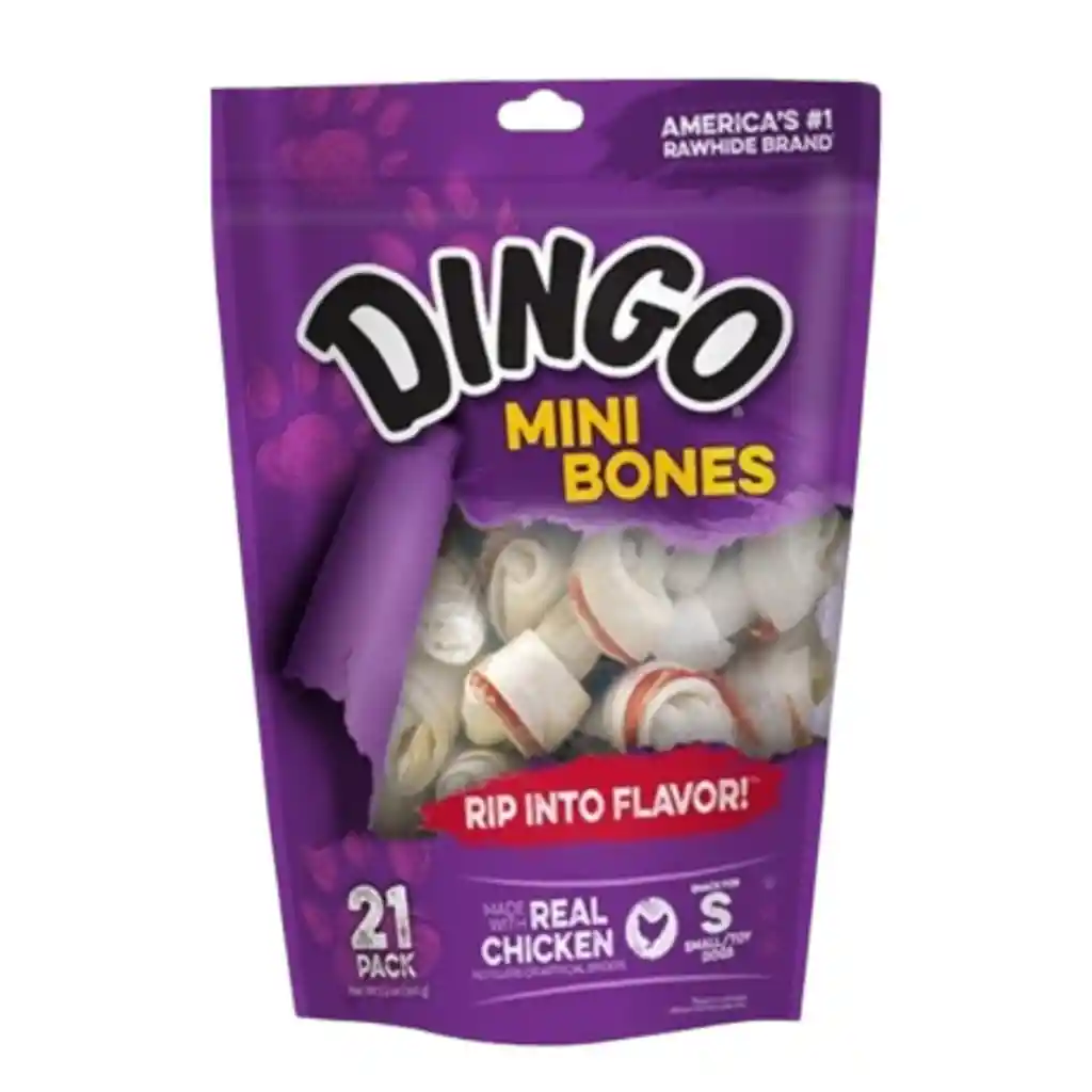 Dingo Mini Bones son unos deliciosos premios y snacks para perros pequeños o miniatura en forma de mini huesitos. Rellenos de carne natural en su interior serán un bocado exquisito para su pequeña mascota. Cada hueso mide 6,4 cms y pesa 85 g. Envase de 7 y 21 uds. Propiedades: Combinación irresistible de pollo real envuelto con cuero crudo premium. Repleto de proteínas. Promueve la masticación para unos dientes limpios y sanos. Sin rellenos ni aglutinantes artificiales. Ingredientes: Cuero crudo, pollo, cerdo, sorbato de potasio (conservante),