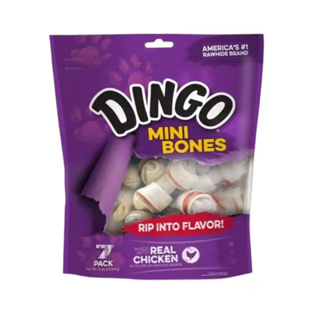 Dingo Original Mini son unos deliciosos premios y snacks para perros pequeños o miniatura en forma de mini huesitos. Rellenos de carne natural en su interior, serán un bocado exquisito para su pequeña mascota. Cada hueso mide 6,4 cms y pesa 85 g. Ayudan a mantener la salud dental de su perro, fortaleciendola y previniendo la formacion de sarro. BENEFICIOS: Dingo Mini Bones 70gr – 7und combinación irresistible de pollo real envuelto con cuero crudo premium Repleto de proteínas. Mascar sano y divertido para promover dientes limpios de la acción natural de masticar, Sin rellenos ni aglutinantes artificiales. INGREDIENTES Carnaza de res Pollo Cerdo Azúcar Sal Sorbato de potasio (conservante) Color rojo.