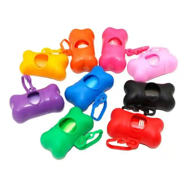 dispensador con forma de huesito incluye cápsulas de plástico resistentes que contienen las bolsas para recoger los desechos de tu mascota. Incluye 2 rollos de repuesto.