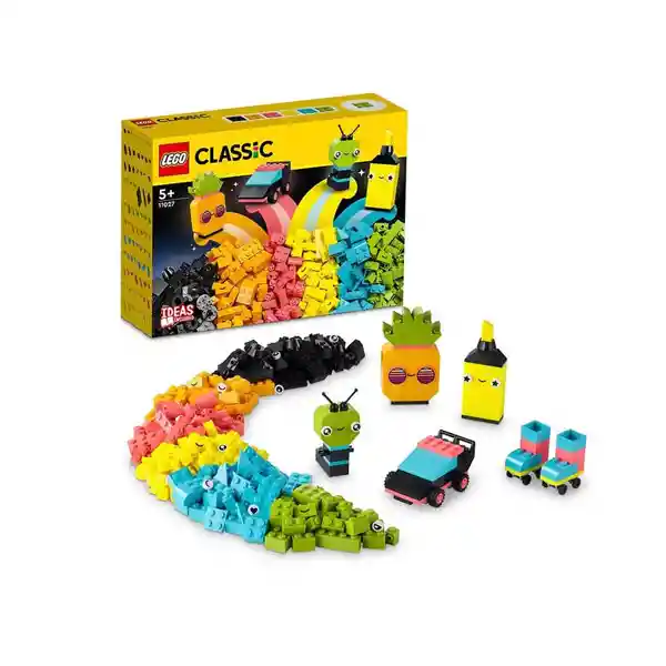 Pon en marcha el desarrollo creativo de tu peque con el llamativo set LEGO® Classic Diversión Creativa: Neón (11027). Incluye sugerencias de modelos rápidos de construir e infinita diversión basada en la construcción libre, y ofrece a los jóvenes constructores a partir de 5 años la oportunidad de disfrutar de su pasión por el arte y el diseño. Ladrillos brillantes para peques creativos Este versátil kit de construcción cuenta con 333 ladrillos de varios tamaños y vivos colores neón. 18 de ellos están decorados con ojos llenos de expresividad que darán vida a las creaciones de los niños y las niñas. Contiene instrucciones impresas para construir 5 divertidos modelos (una piña, un subrayador, un coche, un extraterrestre y unos patines) que permitirán a los peques adquirir confianza suficiente en su creatividad como para atreverse a construir todo lo que puedan imaginar. Las instrucciones de construcción del set también están disponibles en versión digital en la app LEGO Builder. • Brillantes ladrillos para construir: Fomenta la pasión de tu peque por la construcción creativa con el set LEGO® Classic Diversión Creativa: Neón (11027), un juguete de construcción vibrante y versátil para niños y niñas a partir de 5 años. • Color y creatividad: Este set contiene 333 ladrillos de varios tamaños y 6 llamativos colores. 18 de ellos están decorados con ojos llenos de expresividad que los peques pueden usar para dar vida a sus creaciones. • Sugerencias de modelos: Además de infinita diversión basada en la construcción libre, el set incluye claras instrucciones impresas que ayudarán a los niños a montar pieza a pieza una piña, un subrayador, un coche, un extraterrestre y unos patines. • Regalo para niños y niñas: Llena de color el día de cualquier peque creativo de 5 años o más con este regalo perfecto para cumpleaños y fiestas especiales o como sorpresa solo porque sí. • Ideal para jóvenes constructores y constructoras: La guía en imágenes, fácil de seguir, convierte la construcción en una actividad sencilla y divertida. Las instrucciones del set también están disponibles en versión digital en la app LEGO® Builder. • Ladrillos que ayudan a adquirir habilidades: Los sets LEGO® Classic ponen el juego libre en las manos de los jóvenes constructores y promueven la expresión personal creativa. • Calidad garantizada: Los componentes LEGO® cumplen estrictas normas de calidad del sector, por lo que ofrecen siempre las mismas cualidades, son compatibles entre sí y resulta fácil construir con ellos. • Seguridad acreditada: Los elementos y ladrillos LEGO® Classic se dejan caer, se calientan, se aplastan, se retuercen y se analizan para verificar que satisfacen rigurosos estándares mundiales de seguridad.