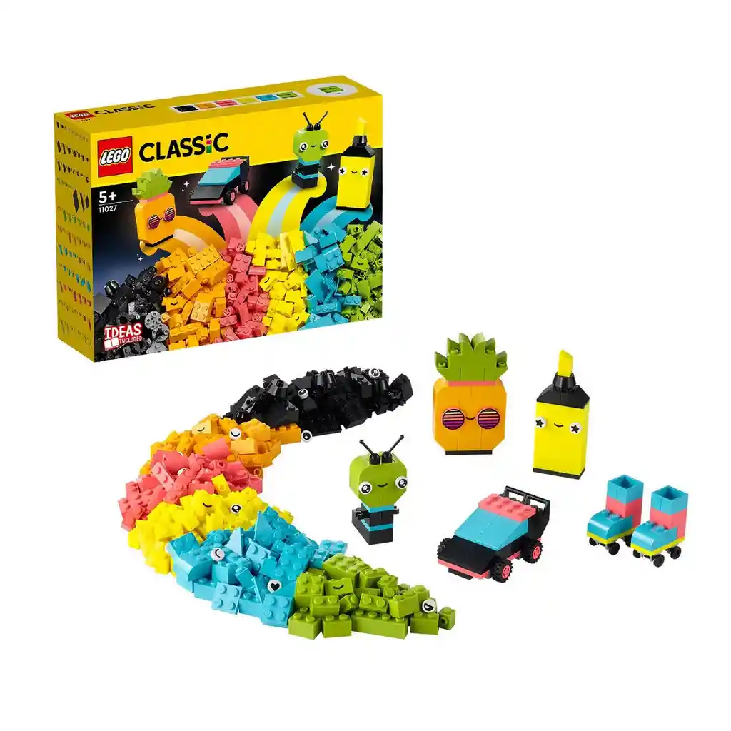 Los más pequeños de la casa podrán poner a trabajar su imaginación y habilidades constructivas con este entretenido set de juego Diversión Creativa Neón de Lego Classic, el cual incluye sugerencias de modelos rápido para construir e infinita diversión basada en la construcción libre y ofrece a los pequeños constructores disfrutar de su pasión por el arte y el diseño. Este versátil set de juego de ladrillos brillantes cuenta con hasta 333 piezas de varios tamaños y en colores neón, 18 de ellos están decorados con ojos llenos de expresividad que darán vida a las creaciones de los niños y niñas. SKU Lego 11027.