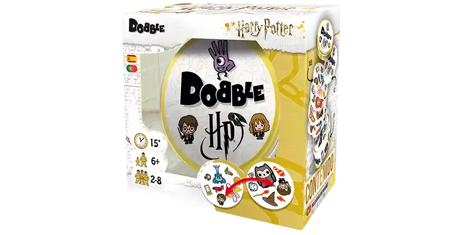 Dobble Harry Potter es un juego en el tendrás que descubrir qué personaje, objeto, bestia fantástica o símbolo de las historias de Hogwarts se repite entre dos cartas. Si nunca has jugado a Dobble, coge dos cartas al azar y ponlas boca arriba sobre la mesa a la vista de todos los jugadores. Busquen el símbolo idéntico en las dos cartas (misma forma y mismo color, sólo el tamaño puede variar). El primer jugador que encuentre este símbolo, lo nombra y roba dos nuevas cartas que pondrá sobre la mesa. Repitan esta operación hasta que todos los jugadores hayan entendido que siempre hay solamente un símbolo idéntico entre dos cartas ¡Y ya está! sencillo, ¿verdad? Pues ahora prepárate, porque Dobble contiene varios mini-juegos, cada cual más divertido e hilarante, aunque el objetivo siempre es el mismo: ser el más rápido, ya que todos los jugadores juegan a la vez. Contenido: 55 cartas e instrucciones.