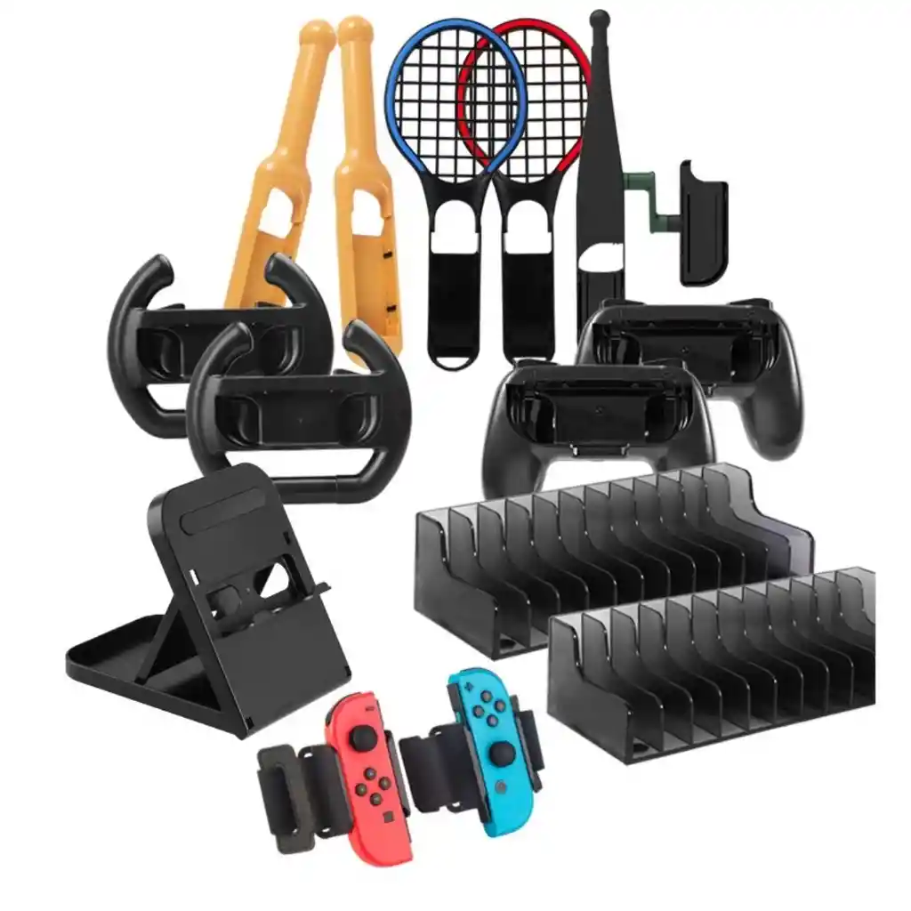 "Dobe - Kit de accesorios deportivos para Nintendo Switch 14 en 1 - TNS-0125 La Nintendo Switch es una consola versátil con la que podemos jugar de formas diferentes gracias a su variedad de juegos. No obstante, hay juegos que requieren realizar movimientos que muchas veces es complicado hacerlos con la consola y sus mandos. Dobe ofrece un kit de accesorios pensados para disfrutar al máximo tu consola y juegos favoritos. Con estos, puedes jugar con comodidad títulos deportivos, de acción, combate, manejo, etc. Estos accesorios están verificados para ser compatibles con la Nintendo Switch y su funcionamiento esta garantizado. El kit incluye: - Caña de pescar x 1 - Base de soporte para la consola x 1 - Palos de batería o baquetas para joy-conx 2 - Muñequeras para Joy-con x 2 - Raquetas de tennis para joy-con x 2 - grip o empuñadura para joy-con x 2 - volante para joy-con x 2 - Base de almacenamiento de juegos x 2 Detalles Técnicos: Marca: DOBE SKU: TNS-0125 Dimensiones: 30 x 20 x 15 CM (la caja) Peso: 1 kg Compatibilidad: Nintendo Switch"