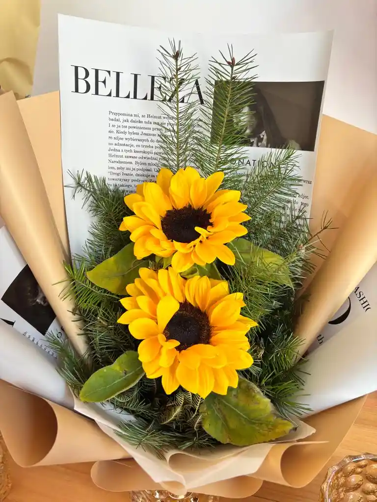 "Como los girasoles miran al sol... así mi corazón gira hacia a ti". Arreglo compuesto por dos unidades de girasoles, acompañados de follaje sutil que resalta su color y energía natural, envuelto en papel coreano. (Color de papel puede variar según disponibilidad). Un detalle vibrante y lleno de vida, ideal para regalar alegría, optimismo y buenos momentos en cualquier ocasión especial.