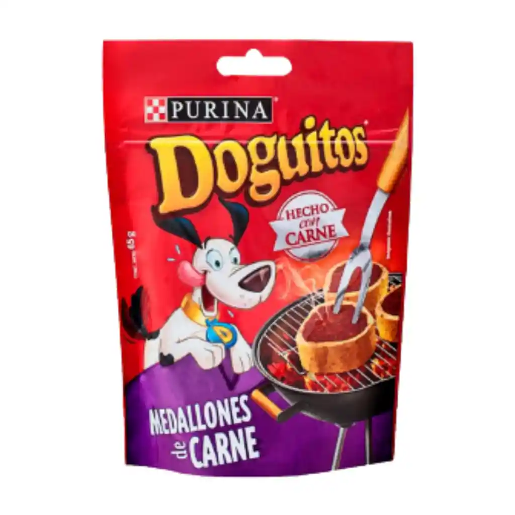 Características: - Doguitos Medallones de carne, son trocitos en forma de trozos de asado con rico sabor a carne y aroma irresistible, - Son bocaditos semi-húmedos para premiar o complementar la alimentación de su perro. - Formulados con ingredientes altamente palatables y exquisito aroma que los hace irresistibles para su perro. - Con cada tierno bocado que se le hará agua la boca. - Doguitos, es una línea de deliciosos bocaditos hechos con carne fresca rico en proteínas sus formatos han sido inspirados en la parrilla que le encantarán a tu perro. Ventajas de este producto son: Elaborados con carne fresca. Enriquecidos con proteínas. Ideal para todas las razas de perros. Son deliciosos trocitos en forma de medallones de carne. Con rico sabor a carne a la parrilla y un aroma irresistible que entusiasmarán a tu perro. Contenido: 65 gr