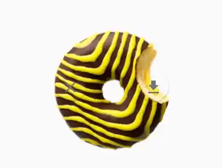 Dona con relleno de crema pastelera, cobertura de cacao y rayas amarillas, porción individual.