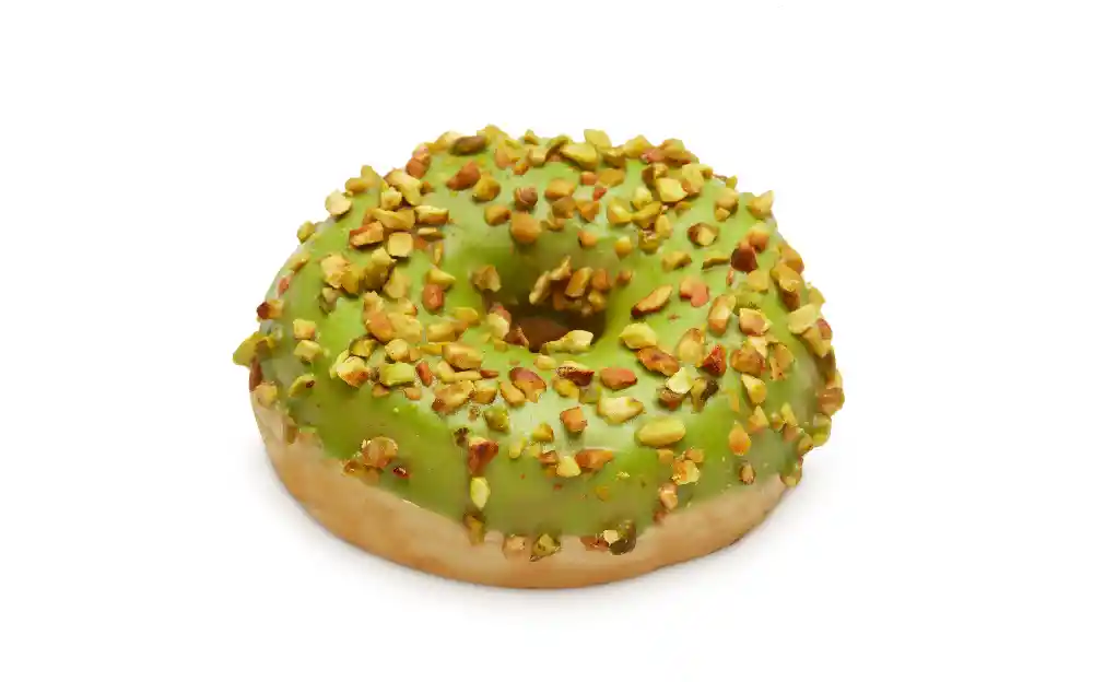 Dona semi cubierta de glaseado sabor frutos secos, con trozos de pistacho.