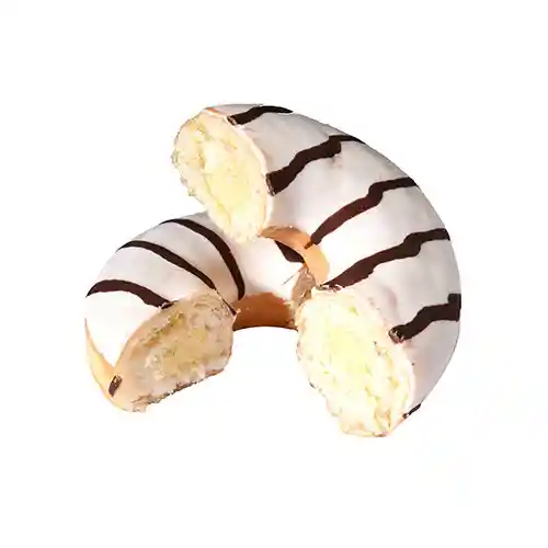 Dona semi cubierta de chocolate blanco. Rellena de crema de vainilla.