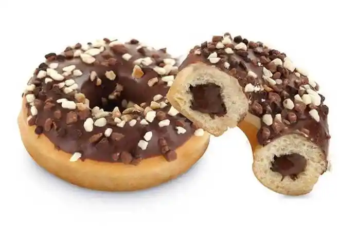 Dona rellena de chocolate, semi cubierta de chocolate con cristales de azucar crocantes.