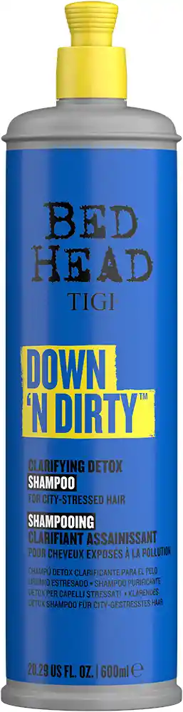 Nuevo Champú Down N’ DirtyTM de Bed Head. Una fórmula épica limpiadora y clarificante, no sólo diseñada sino utilizada por profesionales de los salones de belleza. Brinda los resultados y la experiencia del salón de belleza en la comodidad del hogar. ¡Si te encantó el Champú Re-EnergiseTM de Bed Head, te encantará Down N’ DirtyTM! ¡Da la bienvenida a un cabello limpio de aspecto sano con el Champú Clarificante Down N’ DirtyTM de Bed Head! Este champú desintoxicante limpia de residuos en profundidad el cabello y el cuero cabelludo sin desprender el cabello y humecta el cabello dejándolo con una sensación de suavidad y sano. Formulado con el Sistema de limpieza Beach Rescue que elimina la suciedad y los residuos para dejar el cabello completamente limpio sin desprenderlo, Glicerina, un ingrediente súper humectante que deja el cabello hidratado, suave y sano, y el Extracto de Flor de Loto, conocido por sus propiedades emolientes naturales. Energizante fragancia cítrica especiada