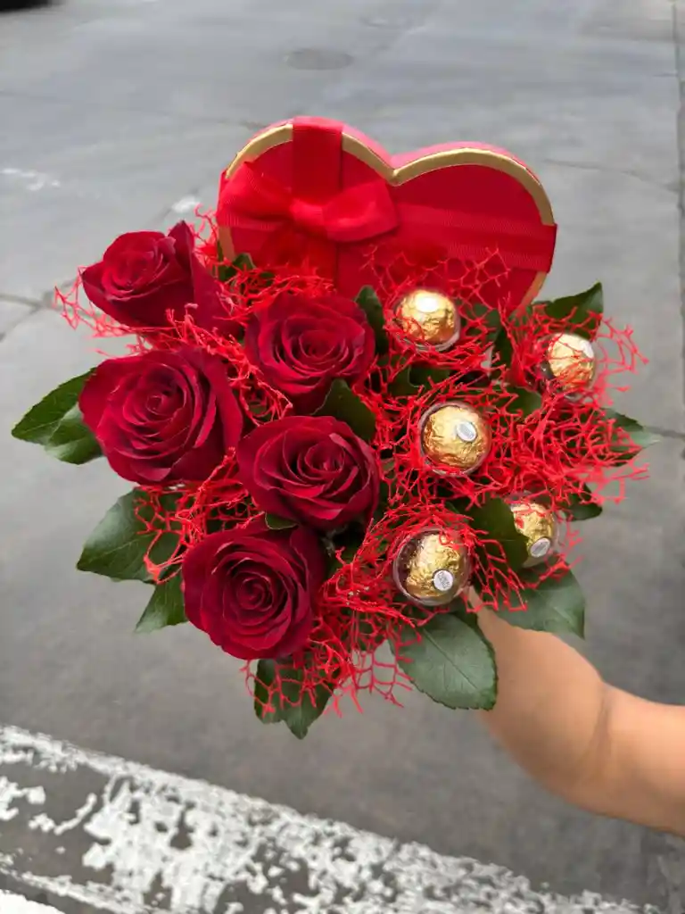 "Flores que enamoran, dulces que conquistan". Este encantador arreglo combina la elegancia de cinco rosas rojas naturales con la dulzura de Bombones Ferrero Rocher, todo complementado con una delicada caja en forma de corazón. Detalles en malla roja y follaje fresco realzan su presentación romántica y sofisticada.
