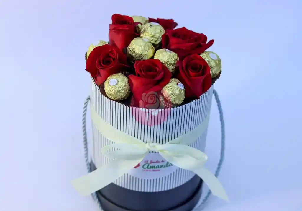 Elegante caja de rosas y bombones Ferrero Rocher. Caja sujeta a disponibilidad del momento. Imagen referencial