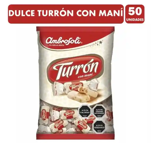 Exquisito turrón de maní marca Ambrosoli. Esta deliciosa combinación de texturas y sabores hará que al disfrutar de esta rica golosina tengas una experiencia inigualable. Esta bolsa contiene 50 unidades (300 grs.) las que cuentan con una envoltura individual que mantiene todo su sabor y frescura y las hace ideales para llevarlas a donde tú quieras, como al cine o a un paseo al parque. Este clásico de clásicos podrás compartirlo con tus amigos o familia y tener un grato momento, sobre todo con los amantes de los dulces. Todos nuestros productos tienen una frescura inigualable ya que renovamos constantemente nuestro stock. Además, cuentan con envasado y sellado de fábrica que permiten conservar el producto fresco e ideal para tu consumo.