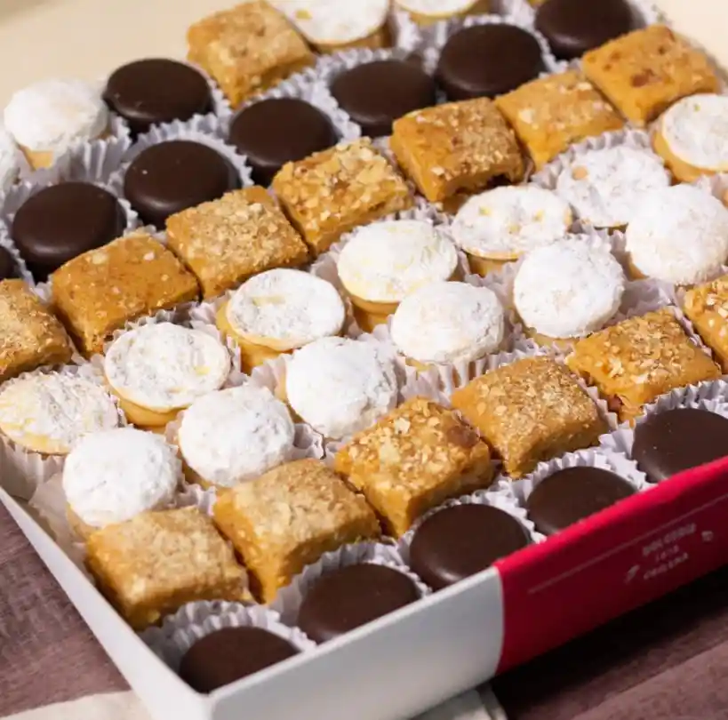 Variedad de dulces chilenos surtidos: mil hojas, empolvado, alfajor San Estanislao y alfajor de hojarasca, todo con nuestro clásico manjar blanco. Hojarasca: alfajor de hoja relleno con manjar blanco. Mil hojas: Pastel cuadrado de milhojas con manjar blanco. Empolvado: alfajor de bizcocho suave con manjar blanco en su interior, espolvoreado de azucar flor. Alfajor: alfajor de manzapán San Estanislao y manjar blanco, cubierto en chocolate bitter. Cantidad: 50 unidades Conservación: Mantener sellado en un lugar fresco y seco , entre 10-18 °C, 65% humedad. Duración: 10 días.