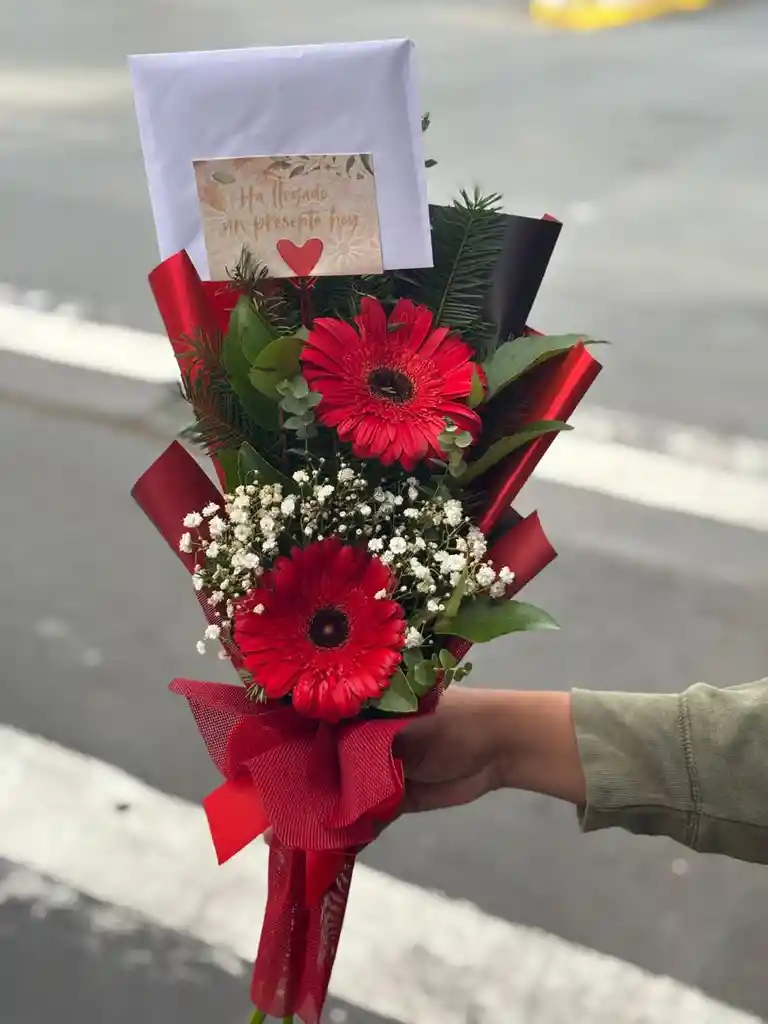 Arreglo de dos gerberas acompañado de gypsophilias, envuelto en papel coreano y arpillera. Disponible en color rojo, rosado, naranjo, amarillo y fucsia (color según disponibilidad). El color rojo simboliza amor y pasión; el rosado dulzura y admiración; naranjo creatividad y calidez; el amarillo energía y felicidad; y el fucsia pasión vibrante y alegría intensa.