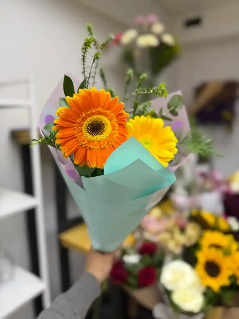 ramo de duo de gerberas de colores surtidos acompañado de verde de temporada envuelto en papel a juego