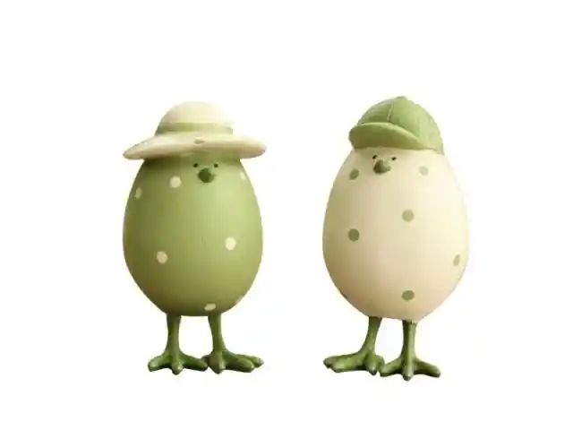 Preciosa pareja de huevos de color crema y verde, con los puntos invertidos. Completos con sombreros, listos para los días de primavera.