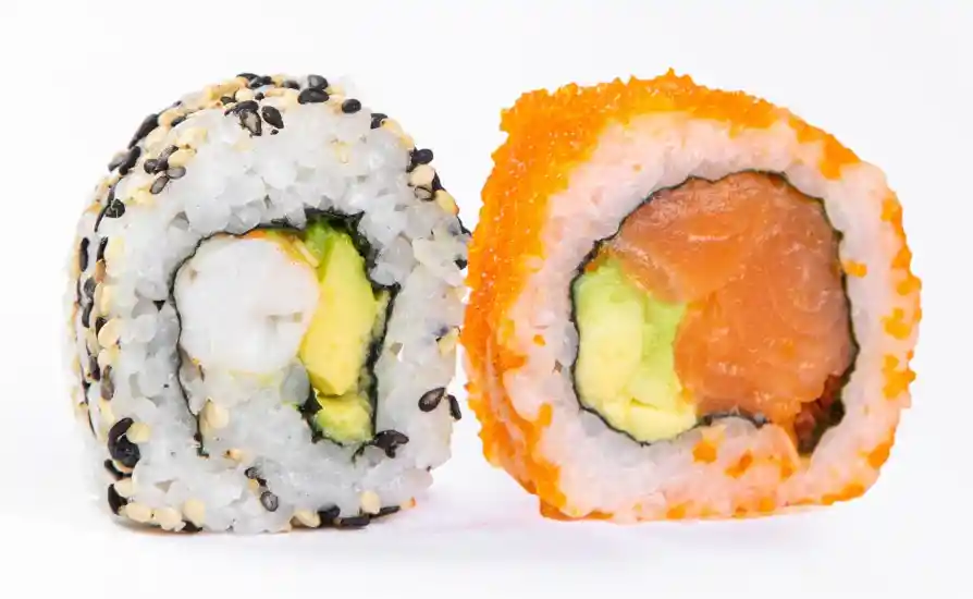 Duo roll salmón / camaron - california ebi turbo (sesamo camaron y palta envuelto en sesamo) y california sake turbo (masago salmón palta envuelto en masago)