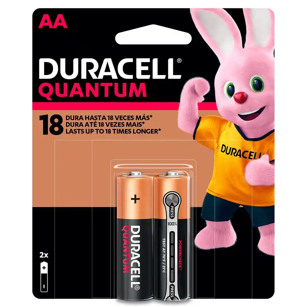 Contiene 2 Unidades. Duracell Quantum Dura Hasta 18 Veces Más Vs. Pilas Comunes de Zinc-Carbón. Los Resultados Pueden Variar Por Dispositivos. Su Innovadora Tecnología de Núcleo de Alta Densidad Utiliza un Proceso de Compresión Patentado y Una Formulación Exclusiva de Ingredientes Para Almacenar Más Energía Dentro Del Mismo Tamaño de Pila. Con un Flujo Mejorado de Energía. Duracell Quantum te Brinda Energía de Alta Duración Para Tus Aparatos. Son Ideales Para Utilizarlas en Aparatos de Alta Demanda de Energía Incluyendo: Juguetes de Alto Consumo de Energía. Controles de Videojuegos. Monitores de Bebes. Flash Para Cámara. y Linternas. Con Exclusivo Medidor de Carga Powercheck Para Que Puedas Utilizar Hasta la Última Gota de Energía de la Pila. En 1969 Duracell es Parte de la Misión Apolo 11 y se Convierte en la Primera Pila en la Luna