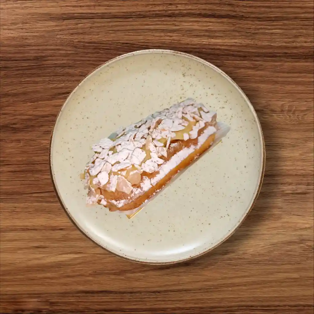 Masa choux, rellena con crema pastelera. Cubierta con crema pastelera y almendras fileteadas