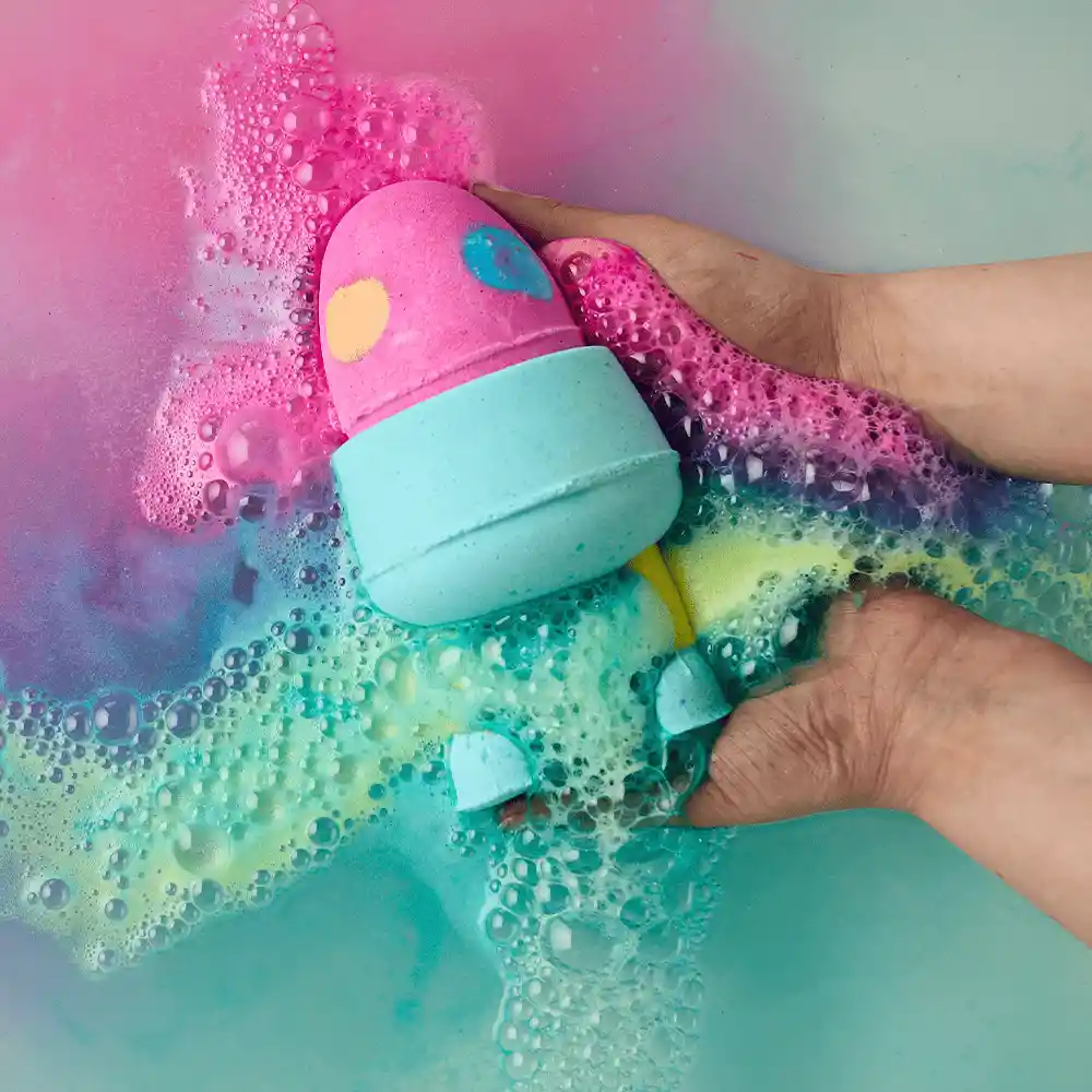 Vive un baño divertido con la bomba de baño Eggs On Legs, que libera colores vibrantes y aceites esenciales para una experiencia relajante.