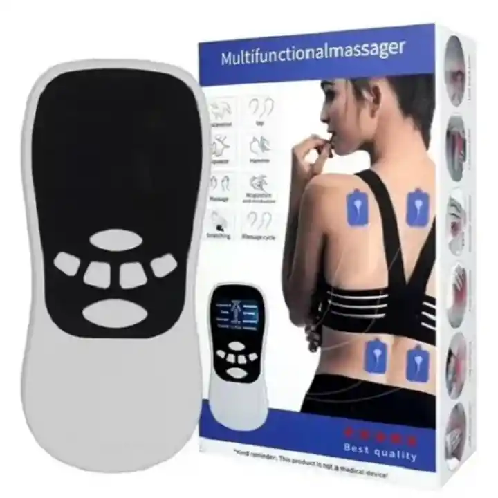 Características principales: Incluye: Dispositivo, 4 parches, 2 cables, cable USB tipo C Modos de uso: 8 programas de masaje (Tuina, Golpes, Amasar, Circular, etc.) Intensidad: 15 niveles ajustables Pantalla: LCD de fácil lectura Beneficios Destacados: Alivio de dolores en cuello, espalda, cintura, hombros y piernas. Mejora la circulación y relaja músculos tensos. Compacto y portátil: úsalo en casa, oficina o viajes. Ideal para deportistas, personas sedentarias o con estrés.