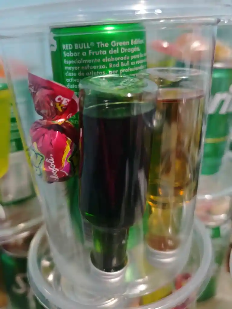 1 Lata de redbull fruta del dragón 250ml 1 botella de whisky de manzana 50ml 1 botella de Amaretto 50ml 1 coyac