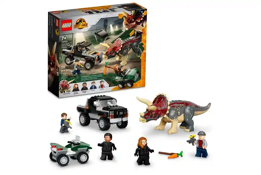 una zanahoria para interpretar imaginativas aventuras. La caja trae instrucciones paso a paso que te ayudan a construir con confianza aunque nunca hayas creado ningún modelo LEGO. ¡Los dinosaurios molan! Los sets LEGO Jurassic World, por su infinita variedad, siempre tienen algo que ofrecer a los fans de todas las edades. • Juego construible para niños con pasión por los dinosaurios y los vehículos de juguete: Los peques podrán revivir la épica acción de la película Jurassic World Dominion con el set Emboscada en Furgoneta del Triceratops (76950). • Dinosaurio de juguete y 4 minifiguras: Una figura articulada de un Triceratops y minifiguras de Claire Dearing, Franklin Webb y 2 guardias de seguridad, que vienen acompañadas de un arma de dardos tranquilizantes y una zanahoria. • Furgoneta y buggy de huida todoterreno: Cada uno de los vehículos de juguete cuenta con espacio para 2 minifiguras. La sección frontal de la furgoneta se desprende y se reconstruye con facilidad, lista para el siguiente ataque del dinosaurio. • Idea de regalo para mayores de 7 años: Regala este set por su cumpleaños, en fechas señaladas o como premio especial a un niño creativo; es perfecto para construir y jugar a solas o en compañía de amigos. • Construye y combina: La furgoneta mide aproximadamente 7 cm de altura, 14 cm de longitud y 6 cm de anchura. Este set puede combinarse con otros juguetes de construcción LEGO® Jurassic World para disfrutar de más opciones de juego. • Instrucciones claras: La caja contiene instrucciones paso a paso ilustradas para construir este set de 210 piezas con confianza aunque nunca hayas creado ningún modelo LEGO®. • Juguetes coleccionables: Los sets LEGO® Jurassic World permiten a los niños (y los fans adultos) revivir las escenas de la serie de animación y las películas, crear nuevas aventuras de dinosaurios o, simplemente, exponer las maquetas. • Garantía de calidad: Los componentes LEGO® cumplen estrictas normas del sector, por lo que ofrecen siempre las mismas cualidades y se conectan con gran sencillez y firmeza. • La seguridad es lo primero: Los elementos y ladrillos LEGO® se prueban de casi todas las formas imaginables y se analizan con exhaustividad para verificar que satisfacen rigurosos estándares mundiales de seguridad.