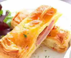 Exquisita empanada de jamon queso en masa de hoja tradicional, queso mantecoso de fundido lento, sabor y calidad garantizada.