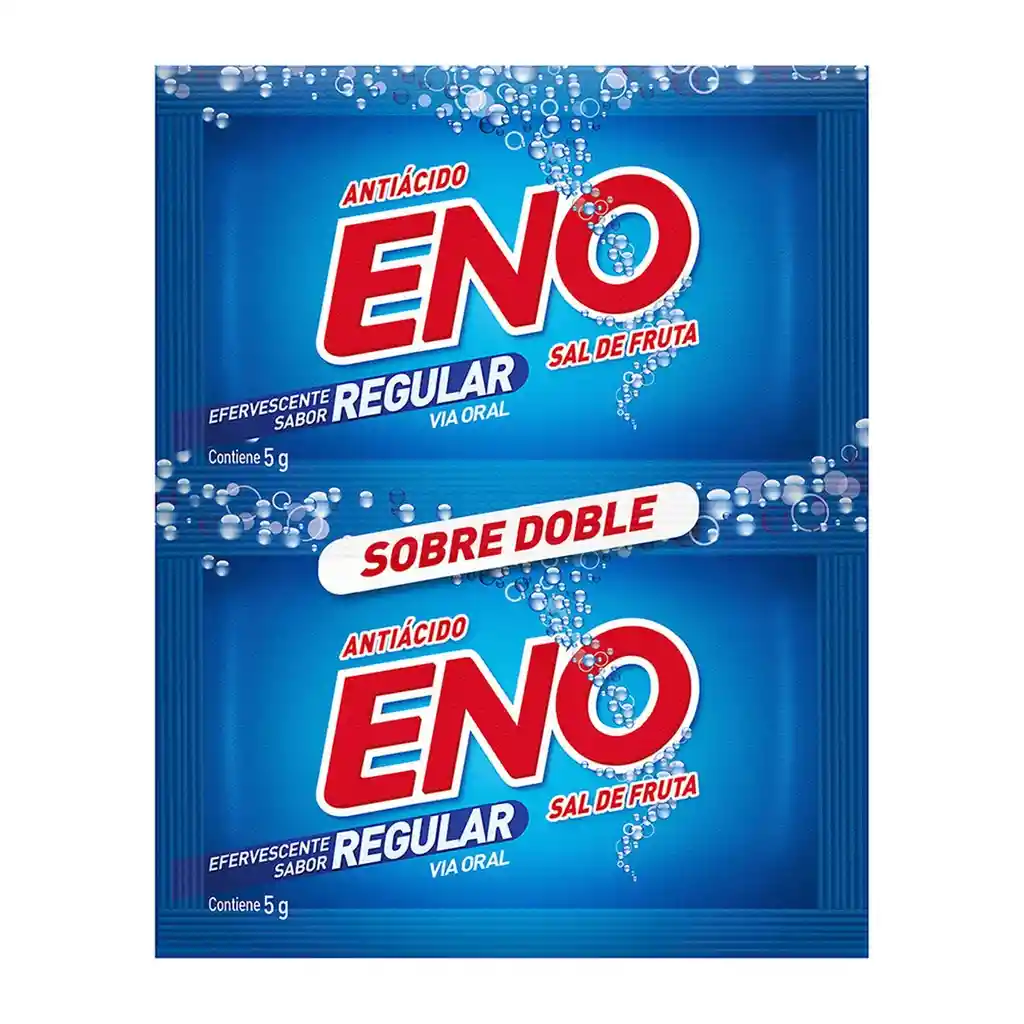 Eno Regular Sal de Fruta - Antiácido Efervescente Eno Regular es un antiácido efervescente indicado para el alivio sintomático y temporal de molestias ocasionadas por la hiperacidez estomacal. Su fórmula combina bicarbonato de sodio, ácido cítrico y carbonato de sodio, ofreciendo un rápido efecto para neutralizar la acidez. Composición Bicarbonato de sodio Ácido cítrico Carbonato de sodio.