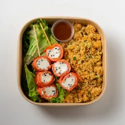 Disfruta de una ensalada fresca y sabrosa con brochetas de salmón ahumado acompañadas de couscous de colores, zapallo italiano, mix de hojas verdes y un toque de limón. Aderezada con un delicioso dressing balsámico y aceite de oliva, esta ensalada se completa con semillas de zapallo maravilla tostada y un toque de ciboulette. Una opción perfecta, ligera y llena de sabor.