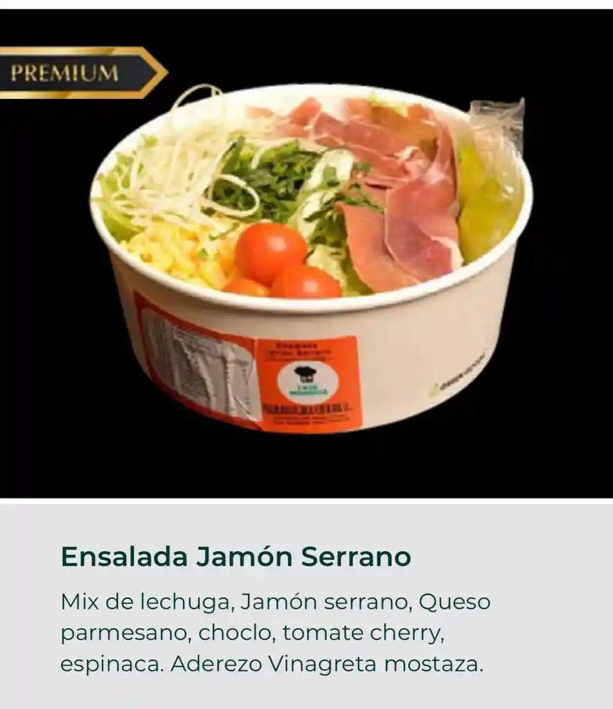 Mix de lechuga, Jamón serrano, Queso parmesano, choclo, tomate cherry, espinaca. Aderezo Vinagreta mostaza