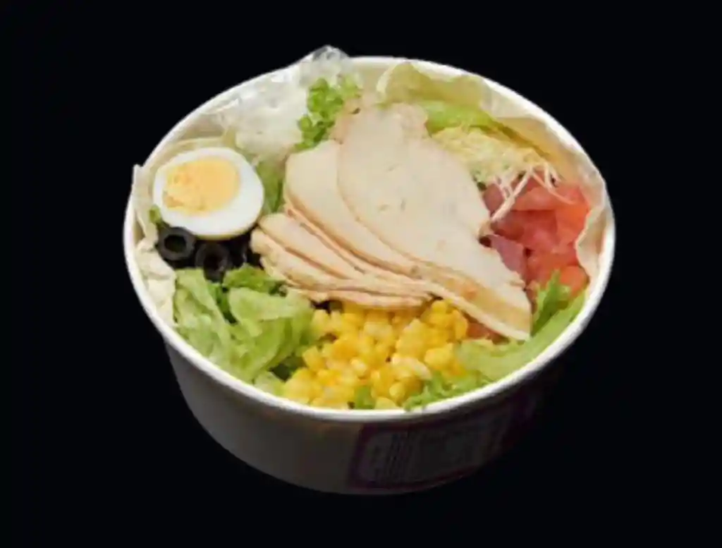 Fajita, lechuga escarola, queso parmesano, choclo en grano, tomate, huevo duro, aceitunas deshuesadas, pollo laminado. Aderezo Mayo perejil.