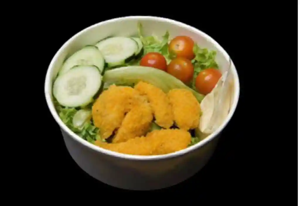 Mix de lechuga, pollo panko, pepino,tomate cherry, aderezo mostaza miel